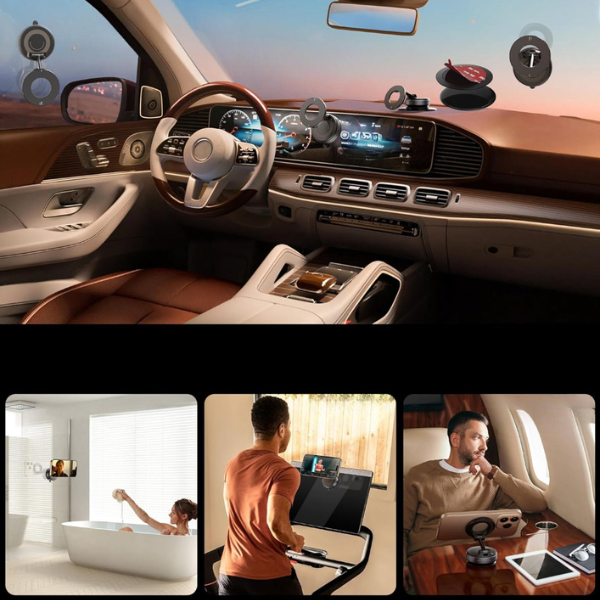 Držiak poskytuje silný úchyt na hladkých povrchoch, ktorý sa otrasmi ešte viac spevňuje. Jednoduchým otočením vytvorí vákuum, ktoré pevne drží telefón bez stôp na skle, palubnej doske alebo stole. Vhodný je na každodenné používanie, doma aj na cestách. Úplná prispôsobiteľnosť s rotáciou