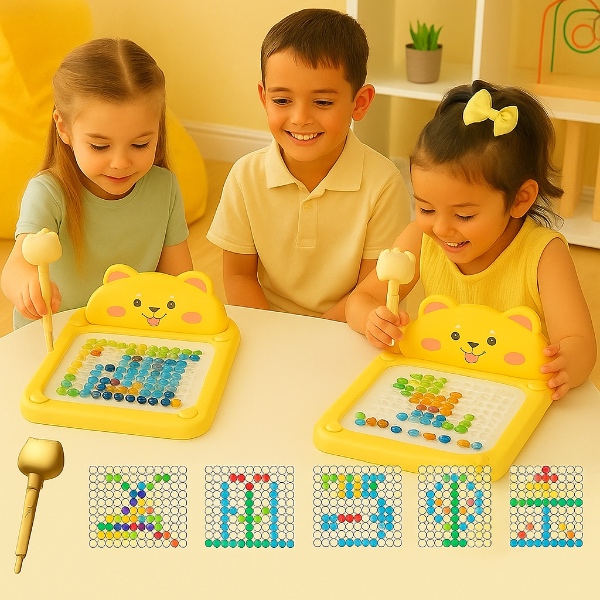 Deti môžu pomocou priloženého magnetického pera kresliť obrázky, vzory a písmená bez použitia papiera či farieb. Čisté, zábavné a poučné hranie.